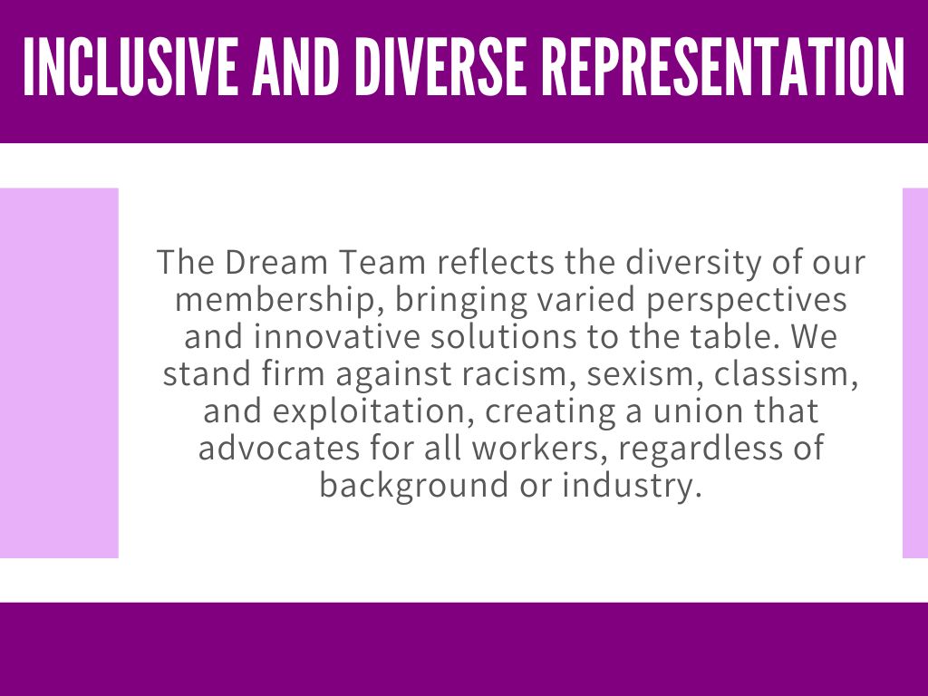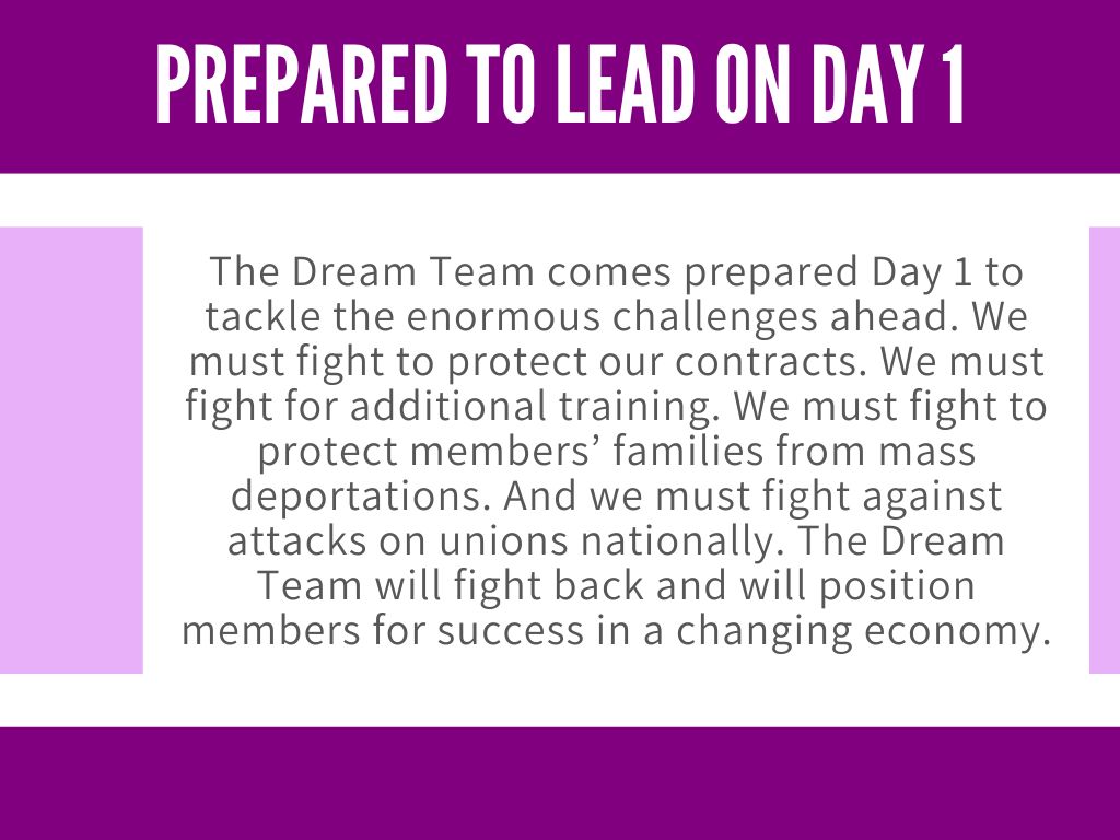The Dream Team is ready to lead on Day 1 to tackle these challenges, backing our talk with collective action. To continue building the power of our union, we must break down silos, improve representation, and engage more members to take action. We believe that all members deserve respect, and our union is the best tool to champion workers on the job and in our communities.